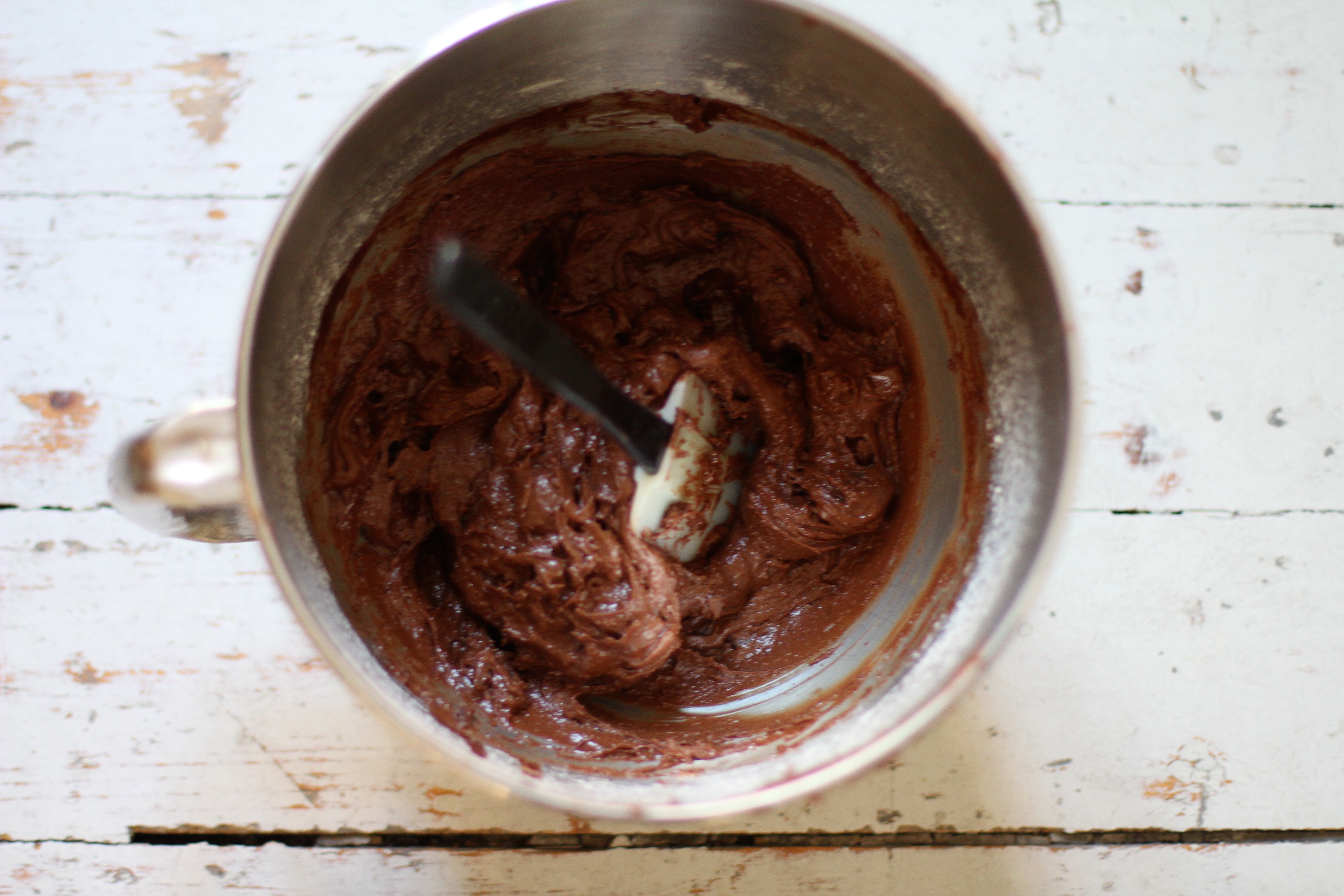 Whip the eggs and sugar to a meringue. This will take aproximately 10 minutes with a kitchen aid. Add the flour and the baking powder. Pour the melted chocolate mix in the bowl. Last, add the chopped chocolate. Leave the dough to rest for 10 minutes, it will thicken a little.