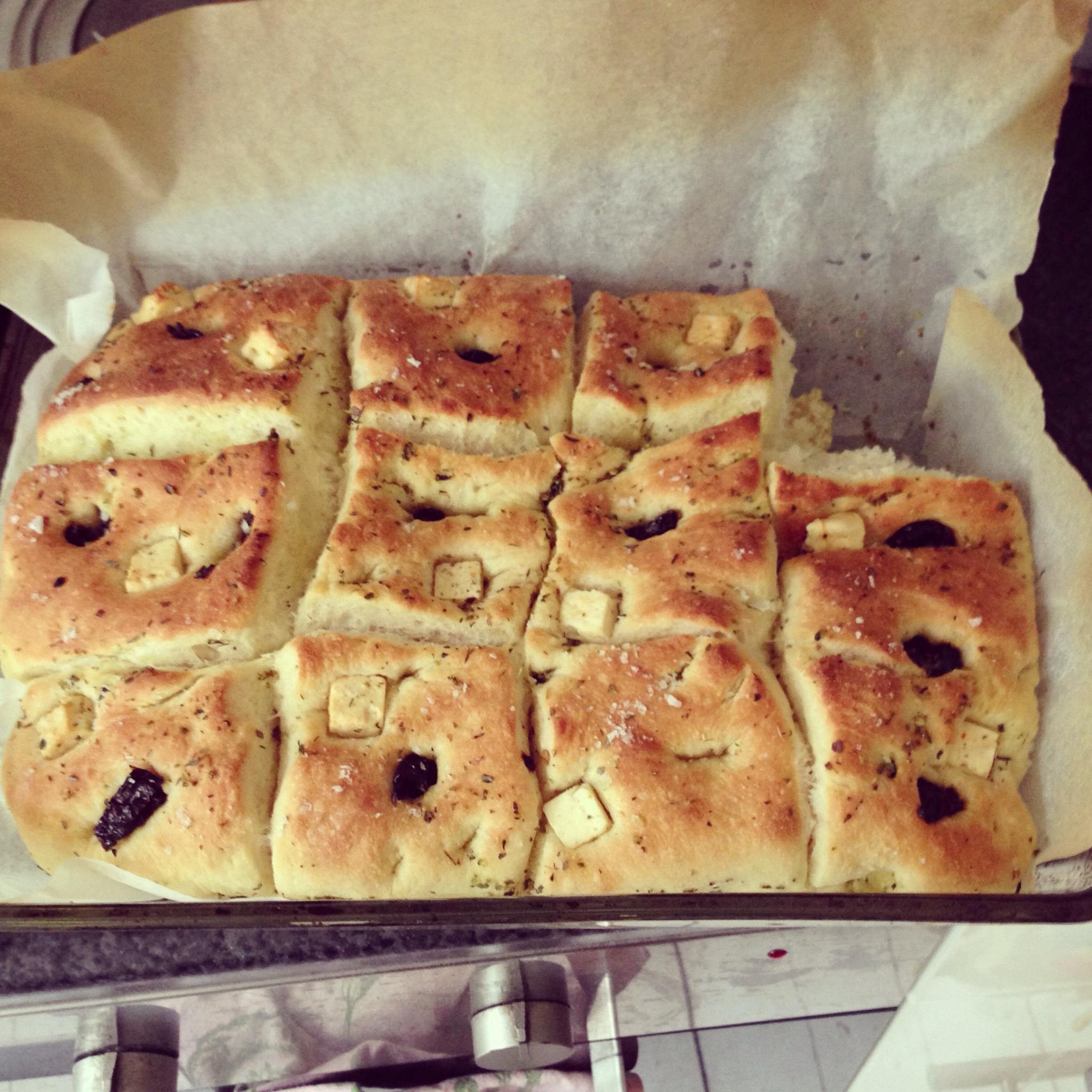 Before putting it in the oven, make some pits with your fingers and pour in the olive oil and herbs. If you add some tomatoes, olives or cheese, be sure to stick them into the dough. Cut the foccacia then into square chunks. Use a sheet of baking paper under and let the dough rest a while. Bake at 220 degrees C for 15 minutes, then take it out and let it rest for 15 min again. Voilà!